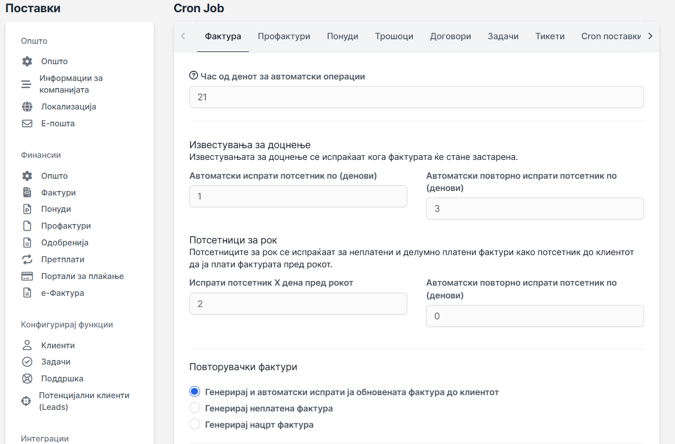 За да го конфигурирате автоматското испраќање на известувањата, одете во: Поставки - Поставки - Cron Job - Фактури.