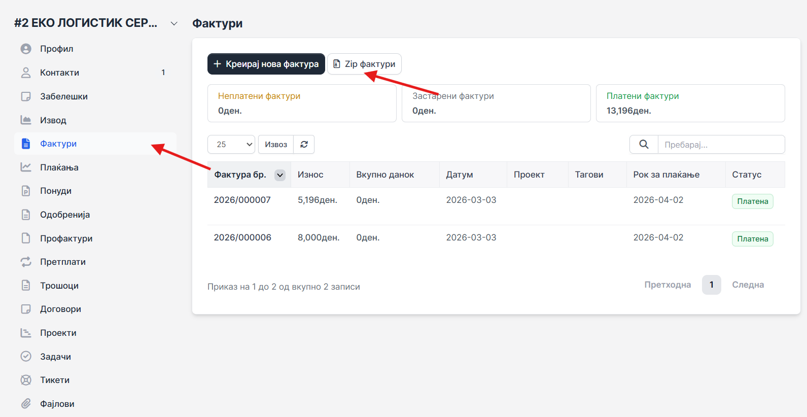 Одете во профилот на клиентот и изберете го табот за податоците кои сакате да ги експортирате (на пр. Фактури).