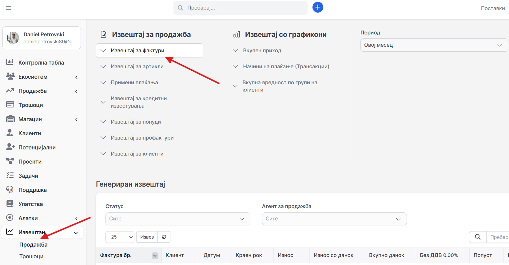 Извештајот за клиенти може да се генерира преку функцијата Извештаи. Изберете тип на извештај Клиент и потребниот временски период за кој сакате да ги видите податоците за клиентите. Ќе се генерира извештај со сите клиенти, каде што само треба да го пребарате клиентот кој ви е потребен за да го видите неговиот извештај.