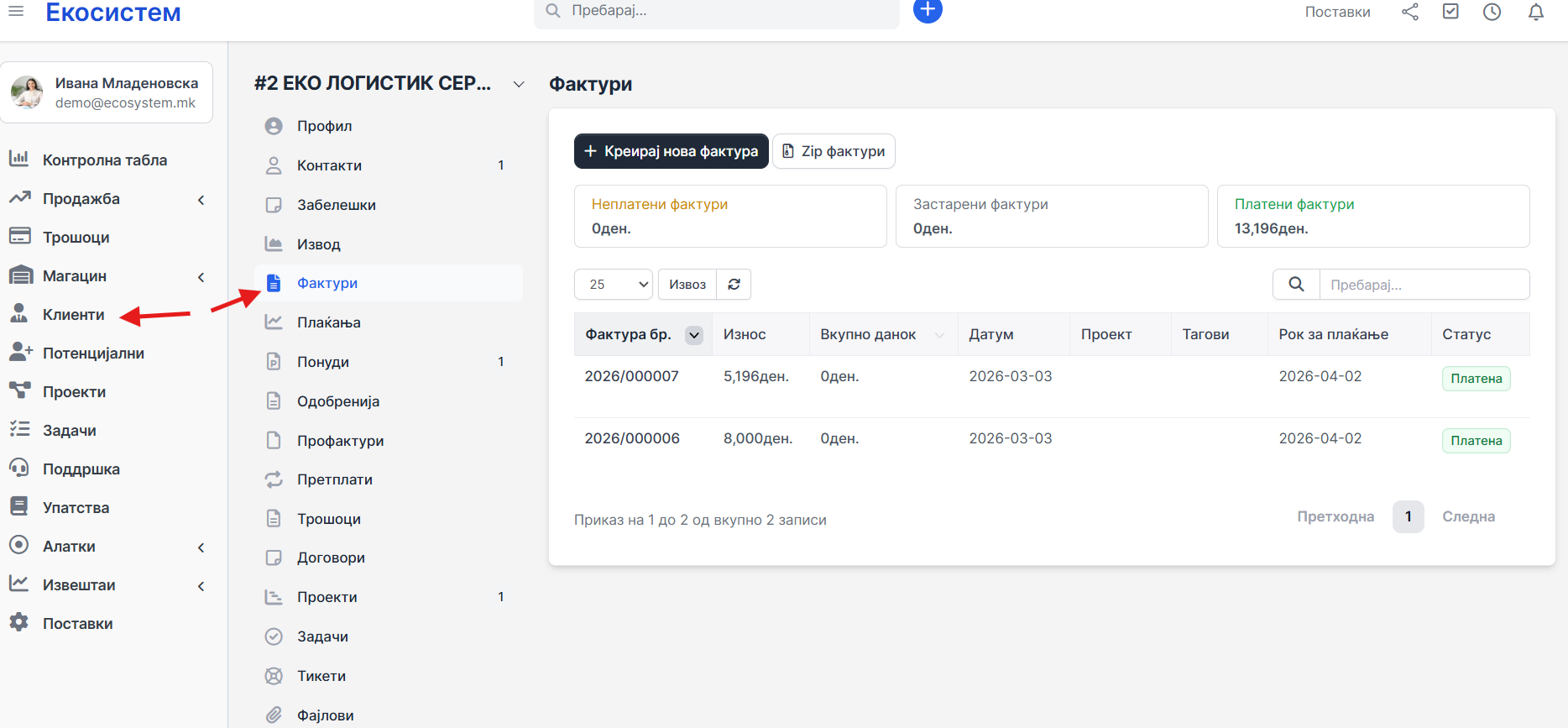 Одете до профилот на клиентот и кликнете на табот Фактури.