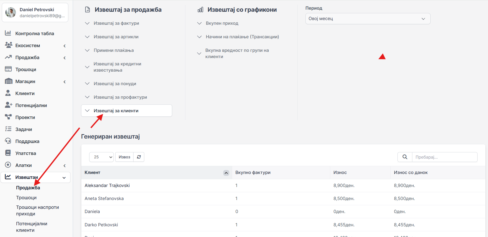 Извештајот за клиенти се креира преку функцијата Извештаи.