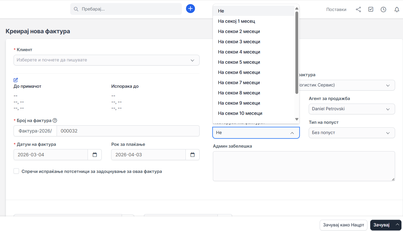 Кога додавате или уредувате фактура, имате опција да ја поставите таа фактура како повторлива. Тоа значи дека фактурата ќе биде автоматски повторно креирана врз основа на вашите поставки за повторлива фактура (на секои X месеци). Можете да поставите повторување од 1 до 12 месеци или да изберете „Прилагодено“ (custom) за да одговара на вашите потреби.